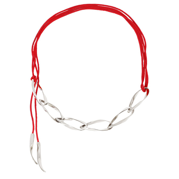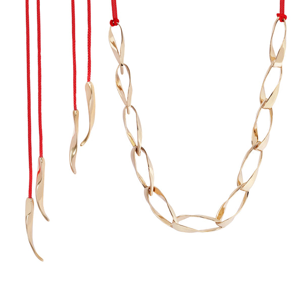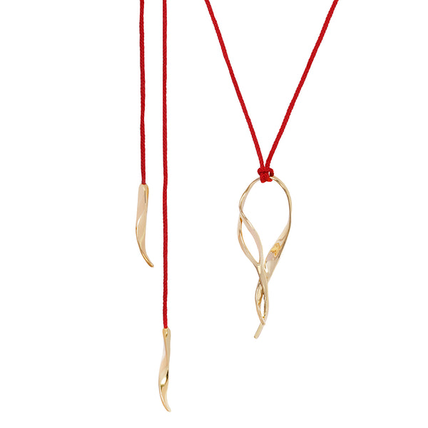 Like a rush of joy to the heart, this unbound ribbon is flowing with abandon, seeking all we desire and setting it free. This exceptional pendant is worn over the heart space; a sinuous snake chain seductively weaves its way through its curves and holds it close to us.